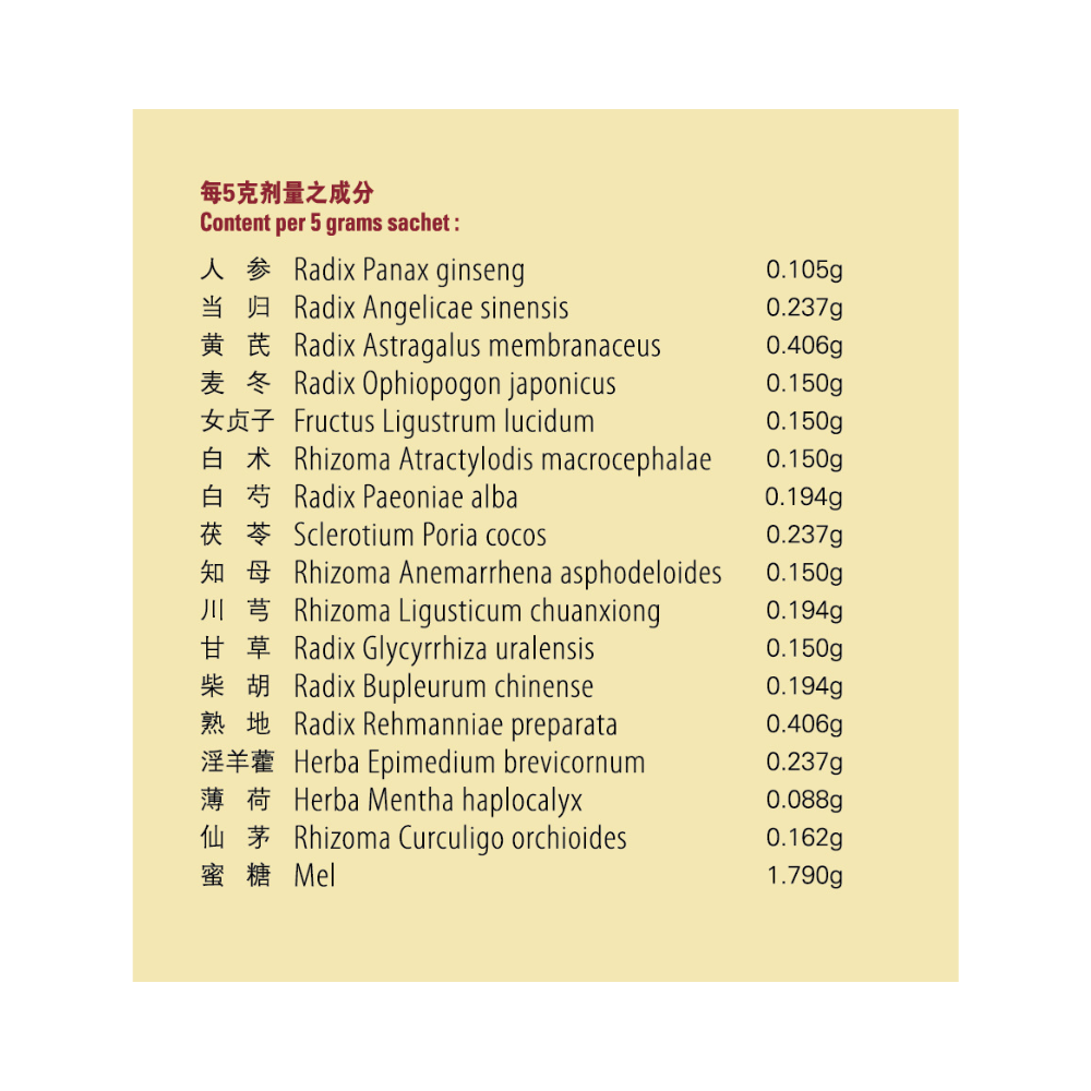 Radix Panax Ginseng, Radix Angelicae Sinensis, Radix Astragalus Membranaceus, Radix Ophiopogonis, Fructus Ligustri Lucidi, Rhizoma Atractylodis Macrocephalae, Radix Paeoniae Alba, Poria, Rhizoma Anemarrhena Asphodeloides, Rhizoma Ligustici Chuanxiong, Radix Glycyrrhiza Uralensis, Radix Bupleurum Chinense, Radix Rehmanniae Preparata, Herba Epimedium Brevicornum, Herba Mentha Haplocalyx, Rhizoma Curculigo Orchioides, Mel.
